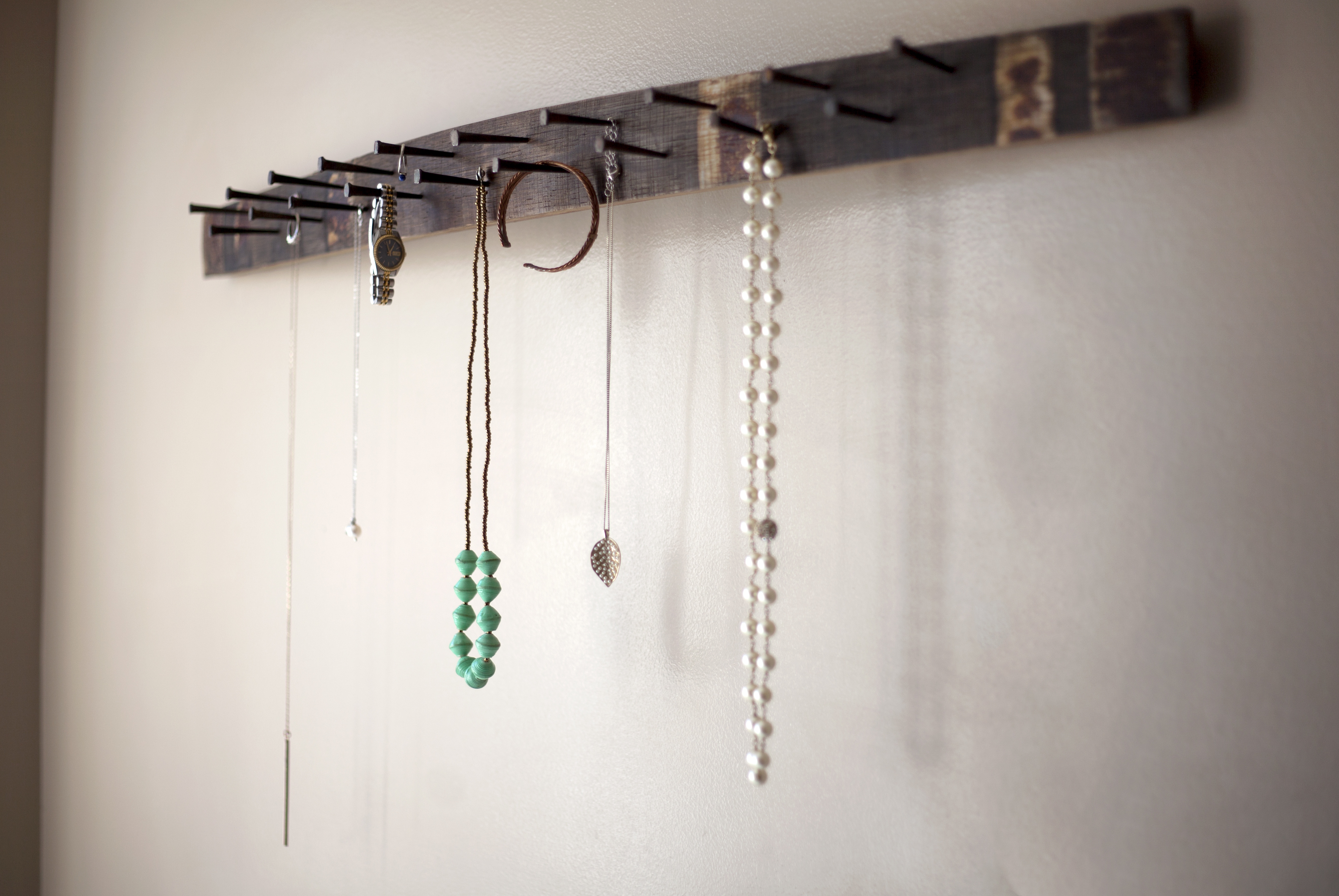 This unique and rustic wall-mounted jewelry display is made from an authentic reclaimed Napa Valley oak wine barrel. Old fashioned masonry cut nails add extra character to the display. There are 19 nail hooks to display your necklaces, bracelets, watches, rings, etc. This is a great gift for Mother's Day, bridesmaids, and wine lovers! Due to the nature of wood and differences in wine barrels, each piece will have its own subtle variations in color, grain, and character. Barrel staves vary in width from approximately 2" to 3.5" Dimensions: 37" wide x 5.5" deep (from wall) x 2"-3.5" stave width mounting hardware included *it is recommended to mount into a wall stud *jewelry not included