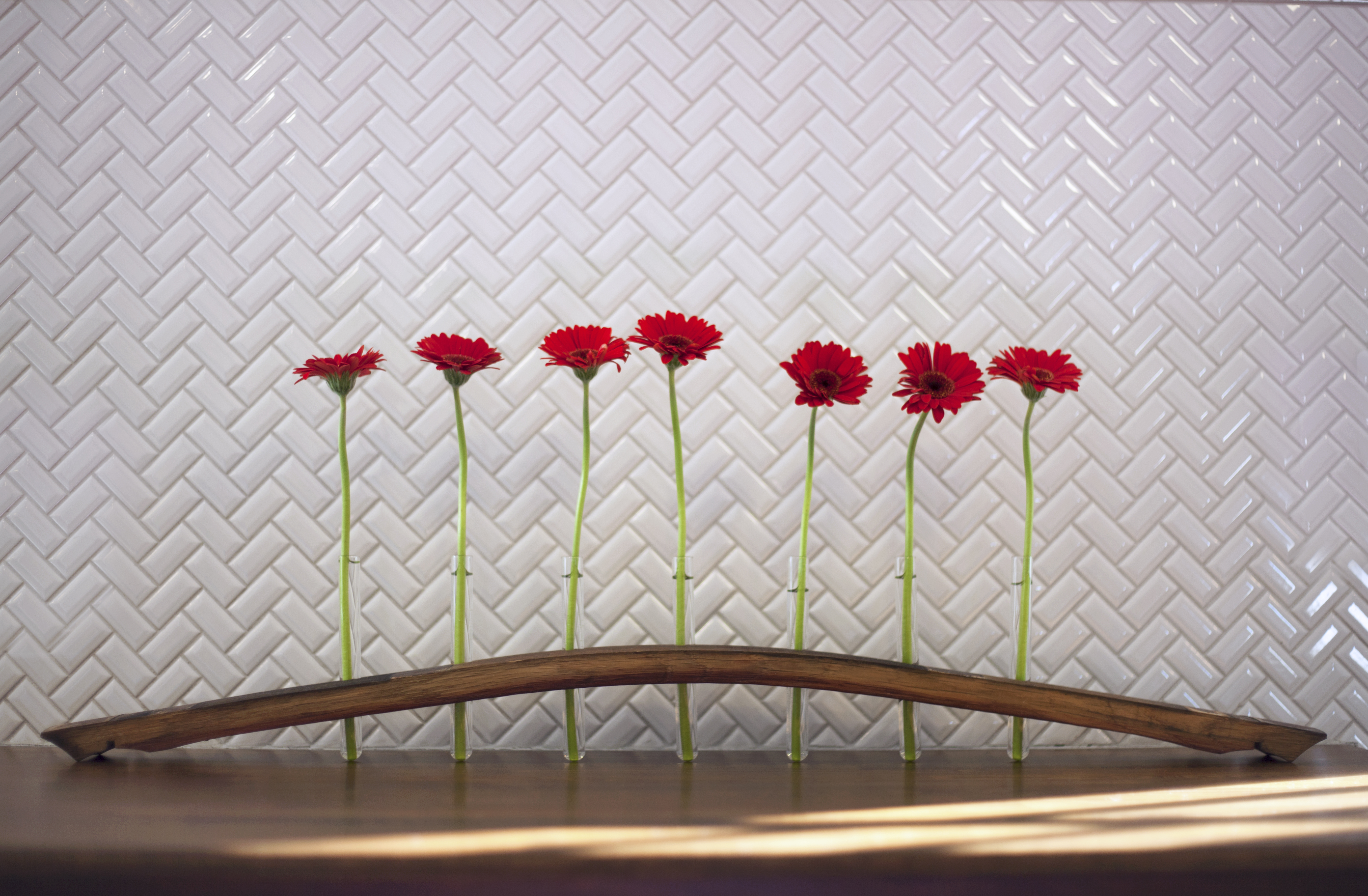 This beautiful and unique bud vase is made from an authentic reclaimed Napa Valley oak wine barrel. It includes 7 glass test tubes, each tube is 6" tall and .5" in diameter. The tubes are removable for cleaning. This bud vase is perfect for displaying single blooms, or multiple small stems. Goes gorgeously with live blooms, or dried flowers. Due to the nature of wood and differences in wine barrels, each piece will have its own subtle variations in color, grain, and character. Barrel staves vary in width from approximately 2" to 3.5" Dimensions: 37" L x 6" H x 2"-3.5" W *flowers not included